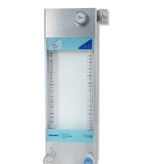 Le corps est en aluminium anodisé et les raccords d'entrée pour l'O 2 , l'Air et le N 2 O au bas du débitmètre sont disposés pour être connectés à des installations de gaz centralisées hospitalières ou à des bouteilles équipées de régulateurs de pression.