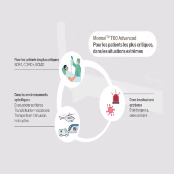 Monnal™ T60 Advanced intègre diverses fonctionnalités permettant de répondre aux besoins de prise en charge ventilatoire des patients les plus critiques (SDRA, ECMO, COVID).