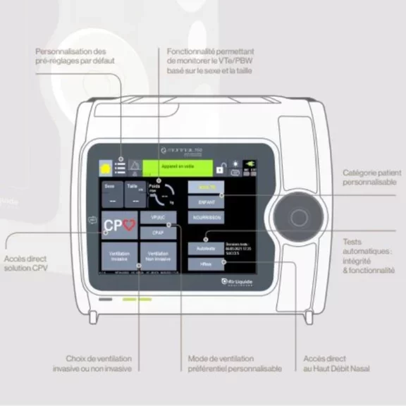 - Pour la prise en charge ventilatoire des nourrissons (à partir de 3kg) à l’adulte : modes de ventilation variés invasifs et non invasifs et Haut Débit Nasal