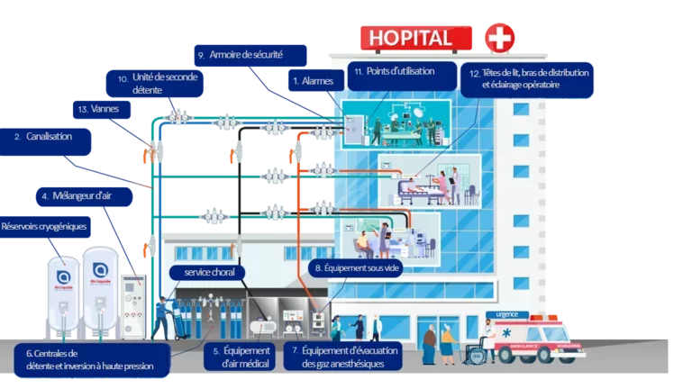 Savoir PlusLe système de distribution de gaz médicaux est destiné à transporter des gaz médicaux depuis les unités de production ou de stockage jusqu'aux prises.
