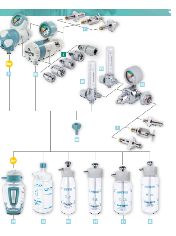 La gamme d'appareils d'oxygénothérapie comprend des débitmètres à section variable, des débitmètres à cadran à trous calibrés , des détendeurs avec leurs raccords de bouteille, des humidificateurs , des sélecteurs de débit et tous les accessoires pour connecter les appareils aux sources d'alimentation en oxygène dans les usines hospitalières.